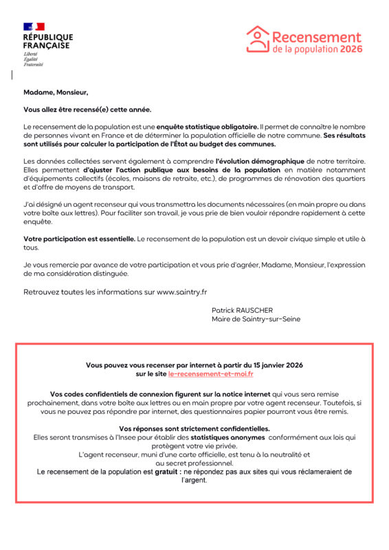 Cette année, Saintry-sur-Seine réalise le recensement de sa population pour mieux connaître son évolution, ses besoins et ainsi développer de petits et grands projets pour y répondre. L’ensemble des logements et des habitants seront recensés à partir du 15 Janvier 2026.